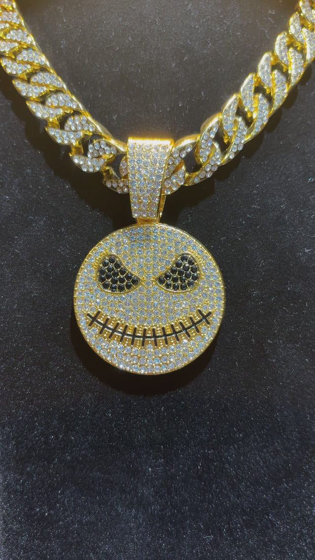 Turn heads with the Golden Grin Cuban Chain — a bold fusion of luxury shine and streetwear attitude. Crafted with a heavy, gold-plated Cuban link fully iced in precision-cut stones, it features a dazzling grin pendant with piercing black eyes and a stitched smile for that perfect rebellious edge.