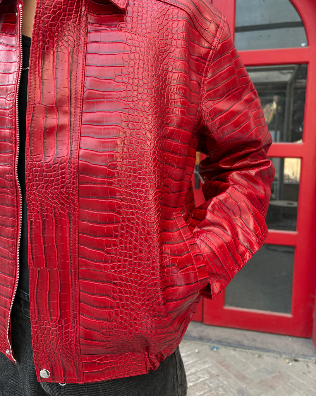 Scarlet Croc leather jacket with satin lining, structured shoulders, and a clean metal front closure for everyday wear.